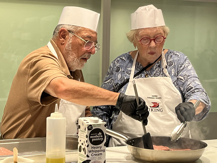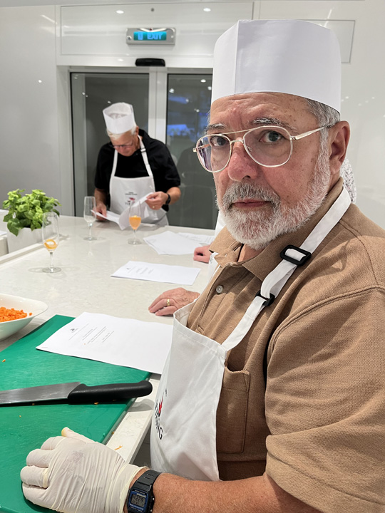 The pièce de résistance however, had to be the cooking class. There were ten of us who attended. The class was run by a lovely lady from Ukraine, a sous-chef in the kitchen hierarchy. We were each issued a white apron with the Viking logo (we got to keep the aprons) and Madame assigned each of us a station around a large table. Everyone had a task: "You must learn to work as a team," she instructed us. My job was two-fold. First I was to chop carrots into very small cubes, as we were making clam chowder for a first course. Later I was given the assignment of grilling the steak burger patties someone else had made. My wife was told off to do key lime pie. After 3 hours all was ready, and we got to eat what we'd made.