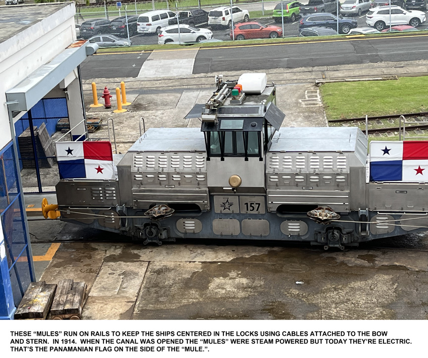 The ships are more or less towed through. Electric "mules" run along tracks on either side of the lock, attaching themselves to the bow and the stern to keep the ship centered in the channel because banging a 49,000 ton ship against the lock walls (let alone the gates) is a very bad idea. The locks we went through were built in 1913; until fairly recently marine architects kept the dimensions of these locks in mind so as to be sure a ship could make the transit. This dimensional specification is dubbed "Panamax," but in recent years the Panamanian authorities have had to construct new locks to allow super-sized tankers and container ships (which exceed "Panamax" dimensions) to transit. Naturally enough these are called "Super-Panamax" locks! No word on whether they have "Super-Mules"!