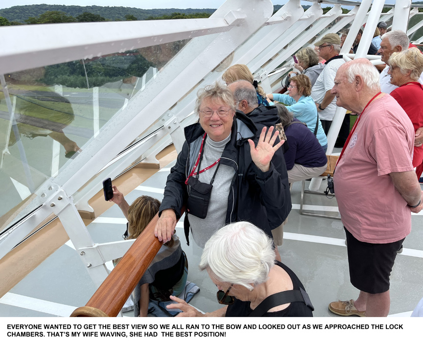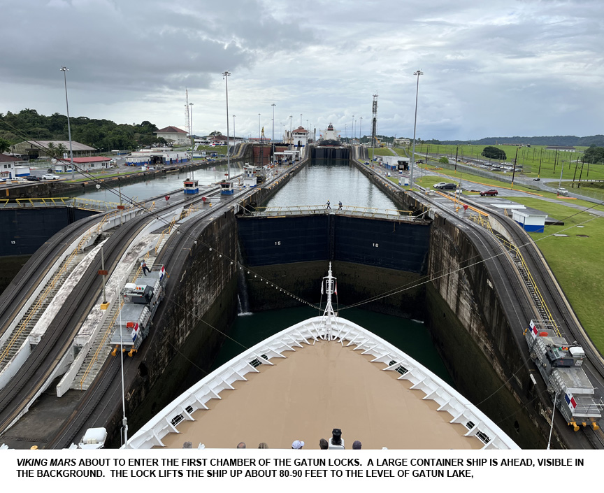 After the cave adventure it was on to the Main Event, the Canal. We had a couple of sea days to get there, during which I luxuriated in Viking Mars' facilities. Viking pitches what they call "cultural enrichment," hiring lecturers to talk about several topics. One of these was a British engineer whose topic was the Canal. He did three talks leading up to our arrival covering the French, American, and Panamanian periods, most interesting stuff. Then as we went forward into the locks he kept up a running narrative on the ship's P.A. system describing what was happening and what we were seeing.