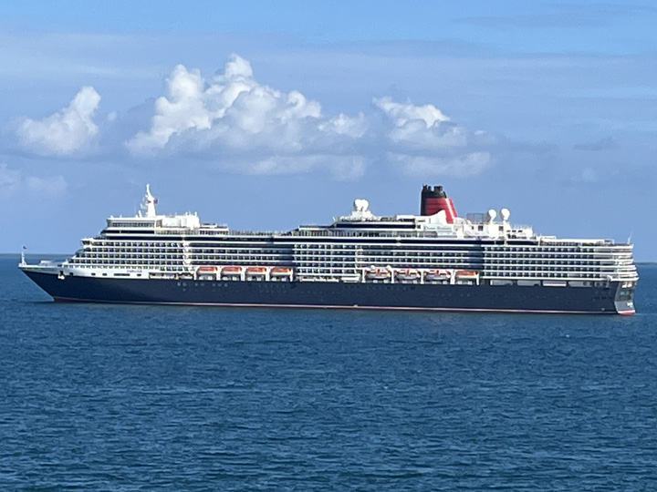 A ship has to have a "reservation" for a transit, they don't just show up and go through willy-nilly. Unlike on our trips across the Atlantic, on this trip we saw lots of ships, most of them anchored in the bay off the Isthmus waiting their turn. The Carribean is a big place but it has lots of traffic. At one point I spotted a ship that as a confirmed Cunard repeat passenger I knew at once to be a Cunard vessel. The forward-raked red-and-black funnel and the odd shape of her superstructure gave her away. It was the new Queen Elizabeth.